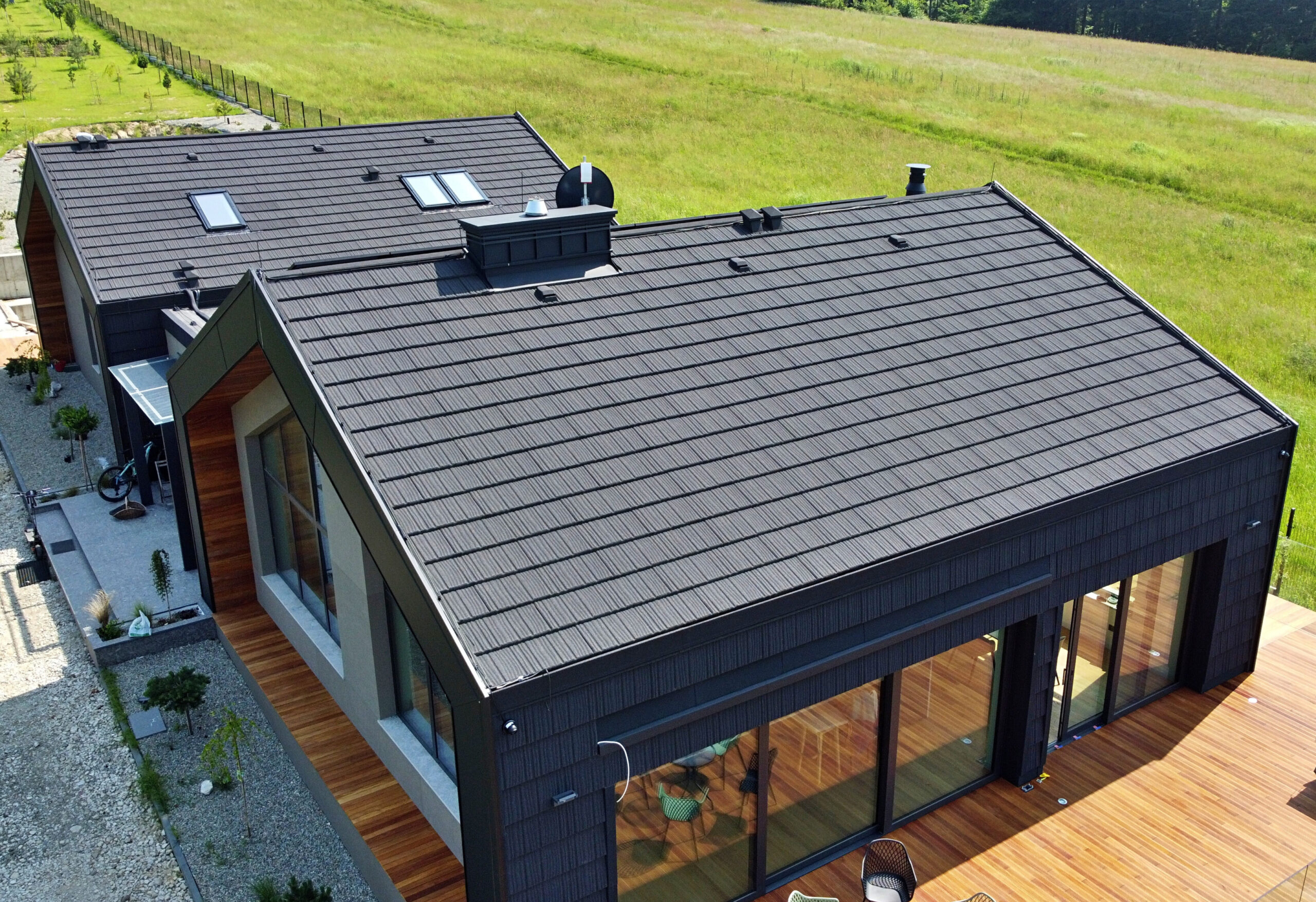 W tej realizacji główną rolę odgrywa blachodachówka z posypką mineralną Małopolska to lokalizacja tego projektu, w którym zastosowaliśmy zaawansowany system ukrytych rynien. Dzięki temu uzyskaliśmy efekt „nowoczesnej stodoły” – dach płynnie przechodzi w elewację, tworząc spójną, minimalistyczną bryłę bez wystających okapów.