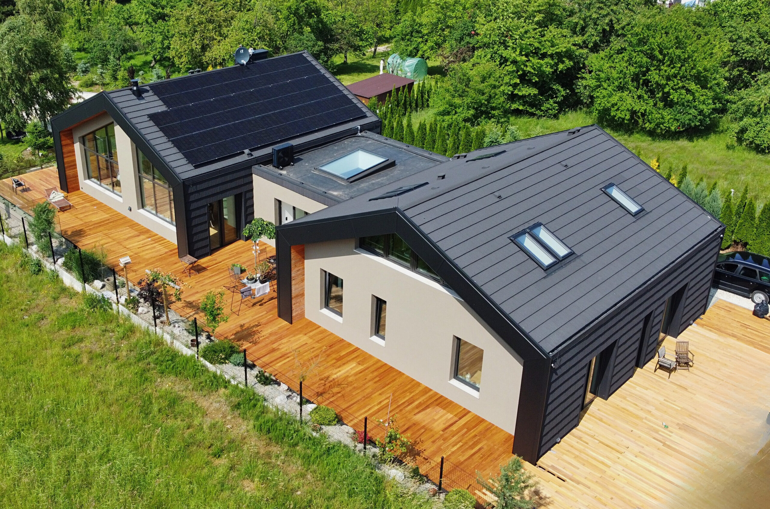 Zastosowana technologia: System Galeco Bezokapowy Kluczowym wyzwaniem technicznym był montaż rynien w warstwie ocieplenia budynku. Zastosowany system ukryty (bezokapowy) wymagał precyzyjnego wykonania obróbek blacharskich, aby zapewnić 100% szczelności przy niewidocznych rurach spustowych. Dzięki temu zabiegowi, bryła budynku zachowała swój nowoczesny, geometryczny charakter.